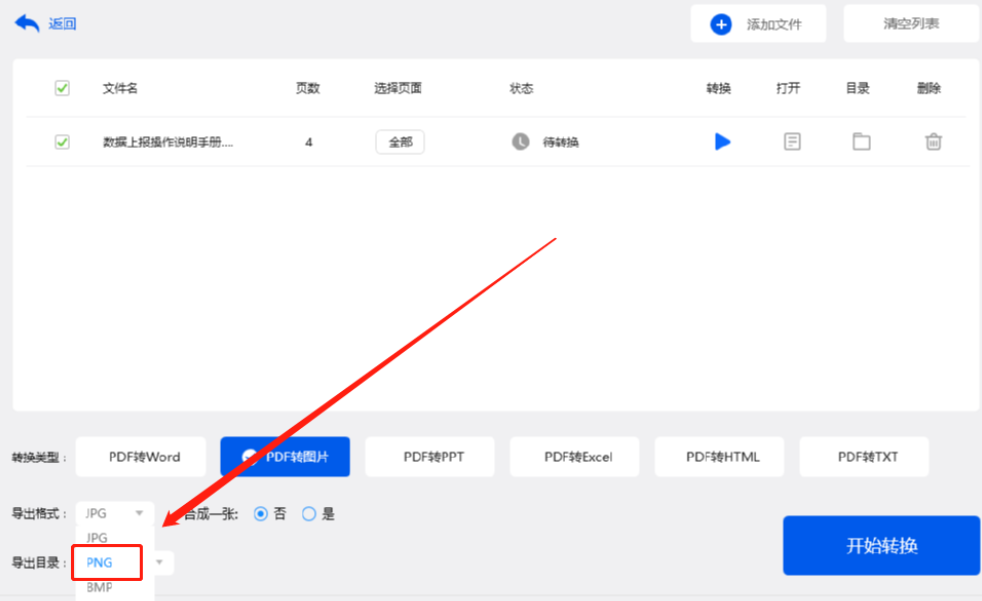 4.点击打开按钮之后PDF文件就成功添加进来了,然后我们在导出格式这个位置点击打开下拉列表,选择想要转换的图片格式。