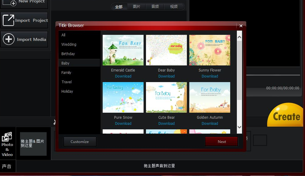 2、接着进入到下图所示的向导窗口中,大家可以在这里下载一个主题,也可以使用左下角的导入按钮来添加自己喜欢的视频文件或是图片文件