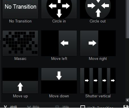 14、在媒体中心右侧可以找到“转场”选项功能,使用转场效果我们就可以在合并视频文件时淡化转场痕迹