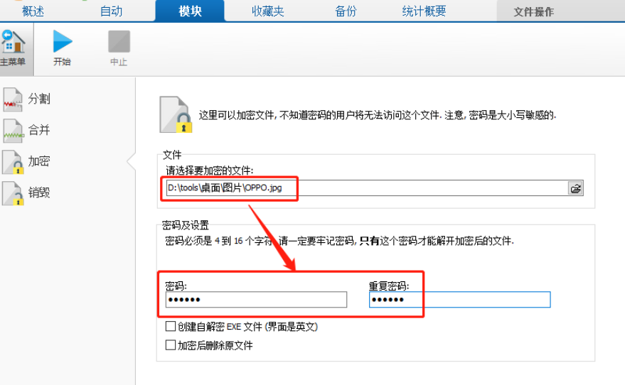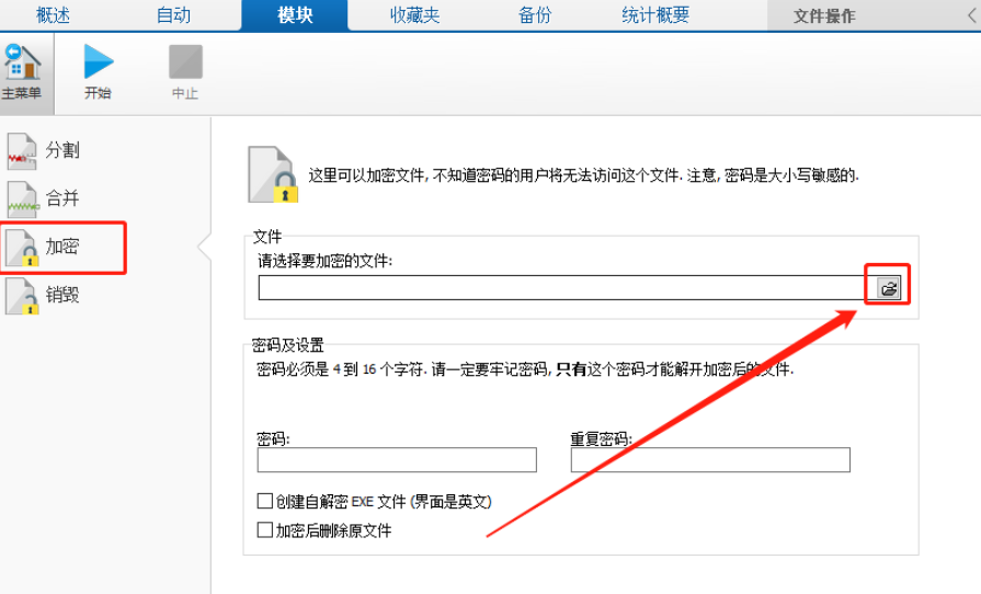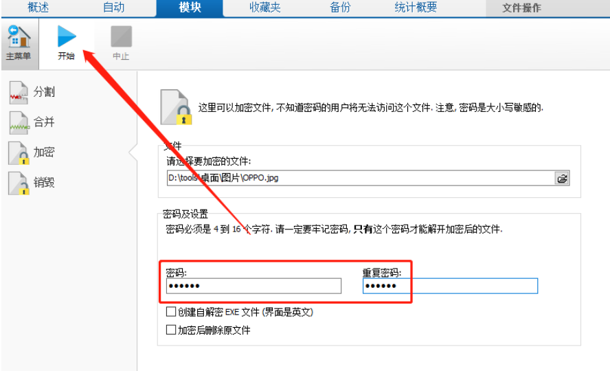 5.点击文件的密码输入完成之后,最后一步我们只需要点击左上方的开始按钮就可以开始加密文件的操作了。