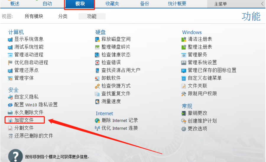 1.首先第一步我们打开软件之后点击切换到模块中,然后在模块界面可以看到有安全工具模块,其中就可以看到加密文件功能。