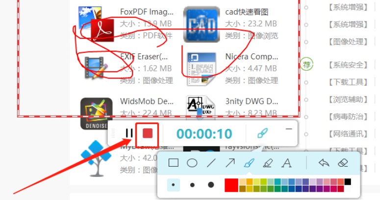 5.开始录制之后点击画笔图标可以在录制界面进行涂鸦,想要录制的内容都录制完成之后,点击界面中红色的正方形图标即可停止录制。