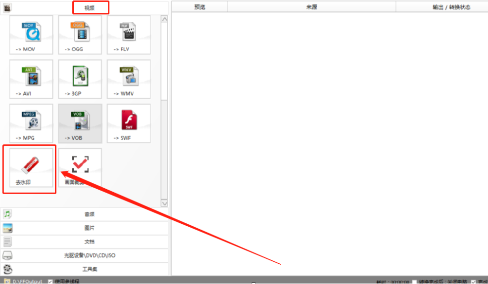 1.首先第一步我们打开软件之后在视频这个模块下面找到去水印功能,然后点击进入到去水印功能界面。
