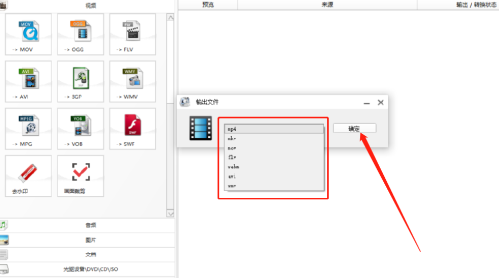 2.点击去水印之后会出现一个选择输出文件格式的界面,我们选择自己想要的输出文件格式之后点击确定按钮即可。