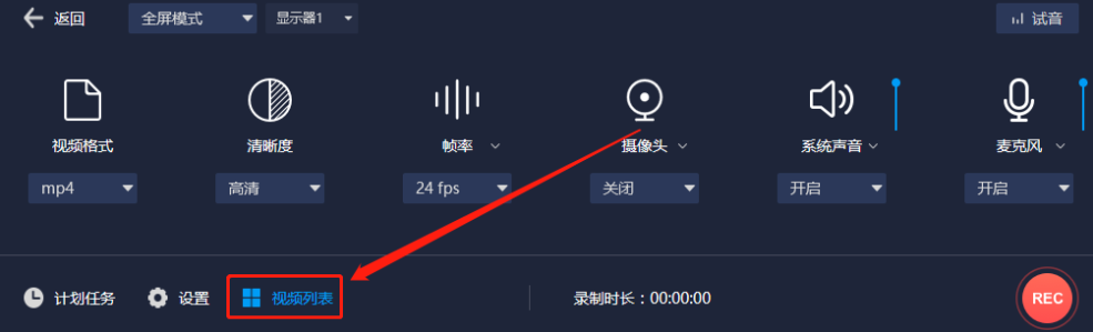 2.进入到录制的参数设置界面之后,点击左下方的视频列表选项,然后就可以打开查看自己已经录制好的视频文件了。