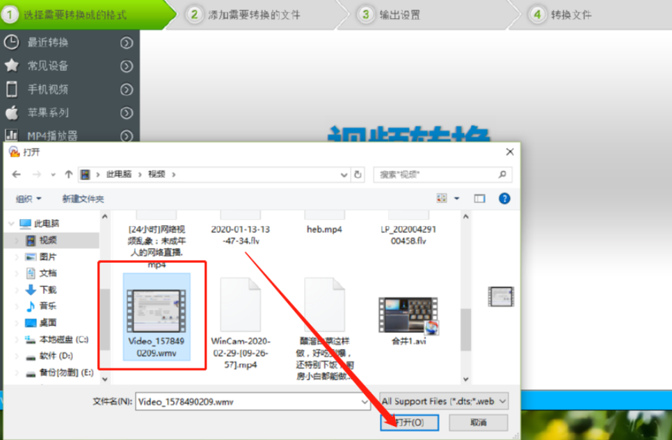 3.点击添加文件之后下一步在打开的选择文件界面中选中目标视频文件之后,点击右下角的打开按钮即可。