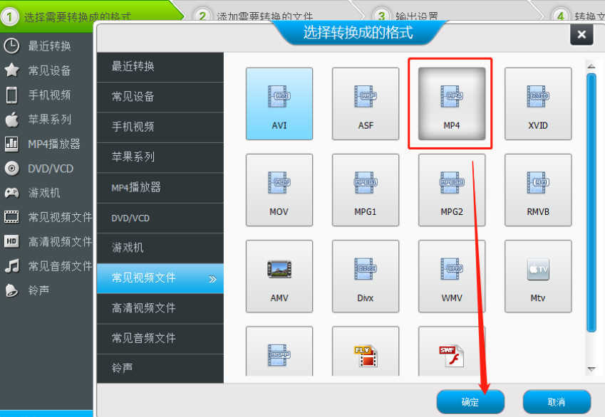 4.点击打开按钮之后选择好视频文件,然后下一步是需要选择想要转换的视频文件格式,选择为MP4格式之后点击下方的确定按钮。