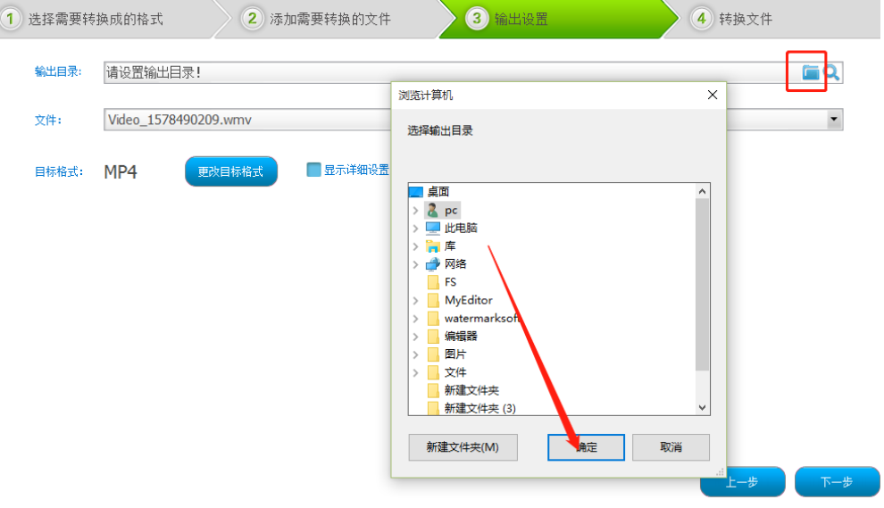 5.点击确定按钮之后我们进入到输出设置界面,点击设置界面输出目录的文件夹图标,然后在出现的选择文件目录界面中根据自己的需求设置文件输出目录。