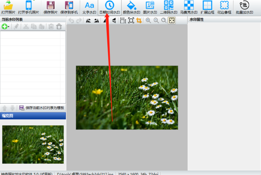 3.点击打开按钮之后图片就添加到软件界面了,然后我们需要点击上方的日期时间水印这个功能模块,进入到日期时间水印的界面。