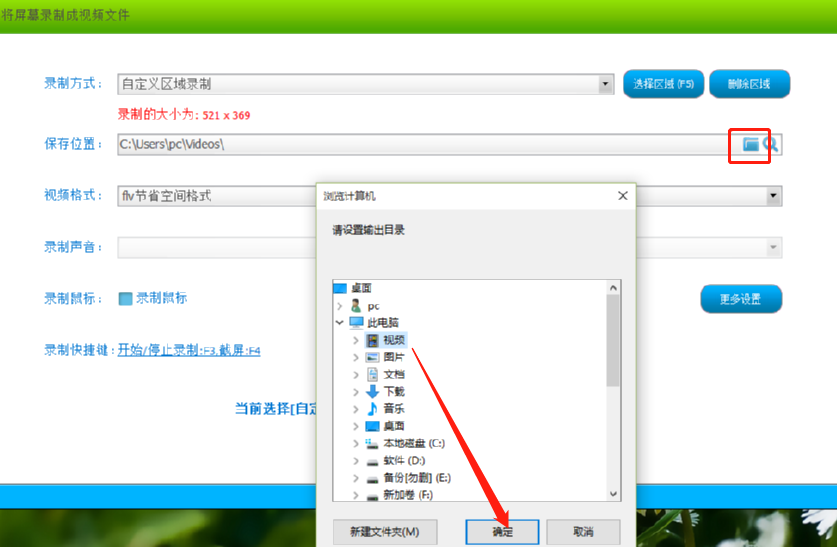 4.区域选择完成之后我们点击保存位置的文件夹图标,在出现的界面可以选择想要输出保存录制视频的文件夹。