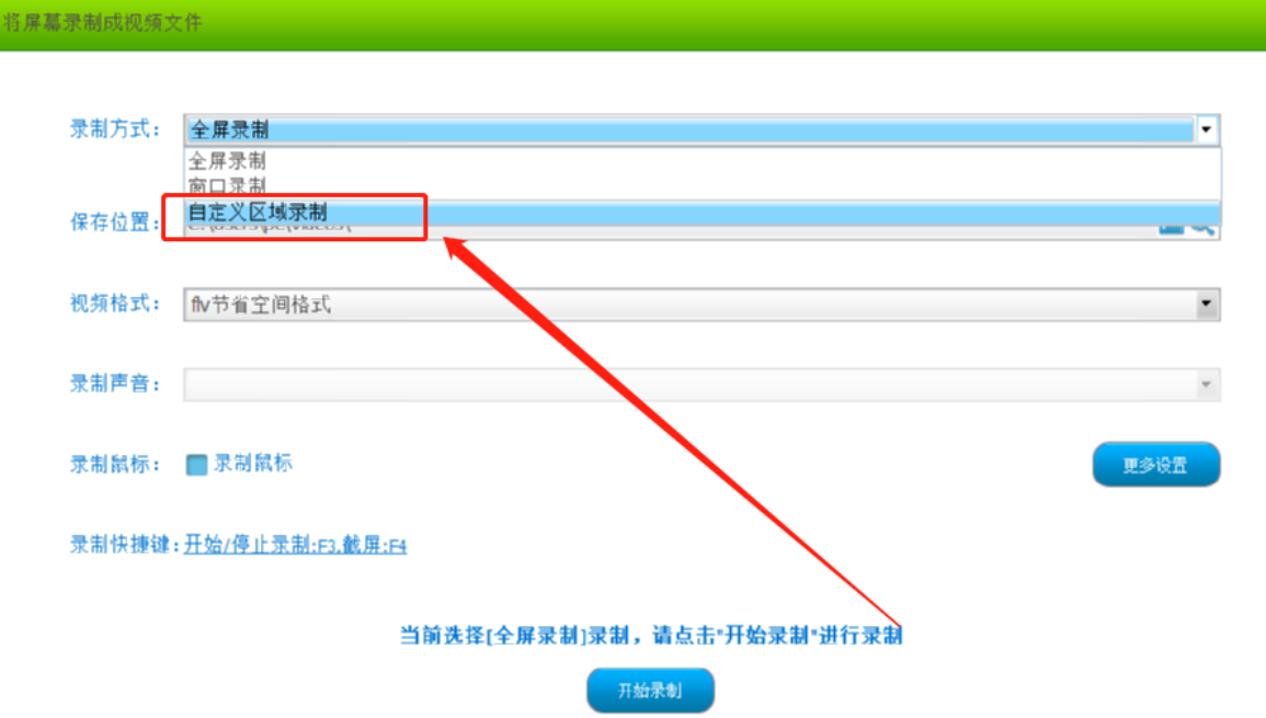 2.进入到屏幕录制功能界面之后,我们在界面的录制方式这里点击下拉按钮,然后选择自定义区域录制这个选项。