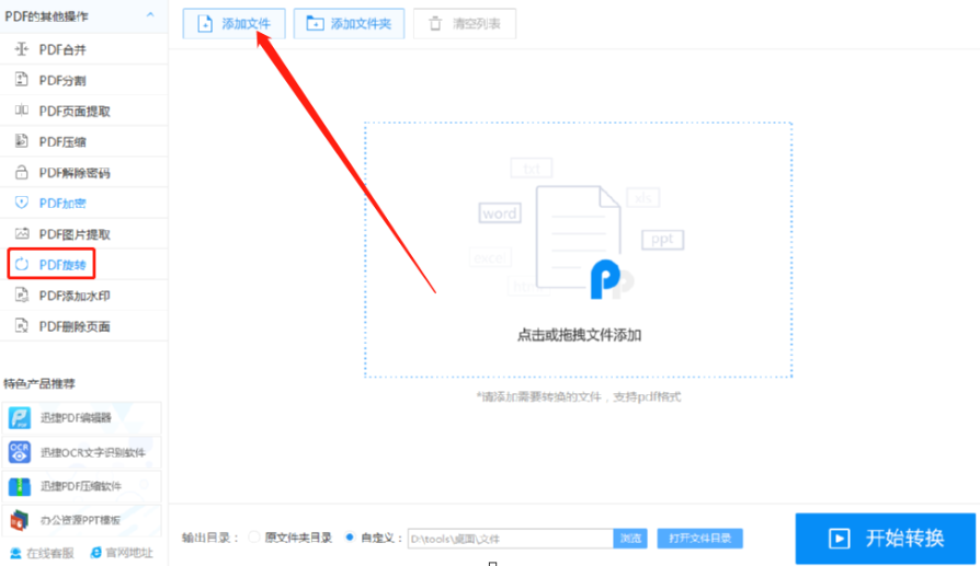 1.首先第一步我们打开软件之后在界面中点击PDF操作这个功能模块,然后选中左边的PDF旋转功能并点击添加文件按钮。