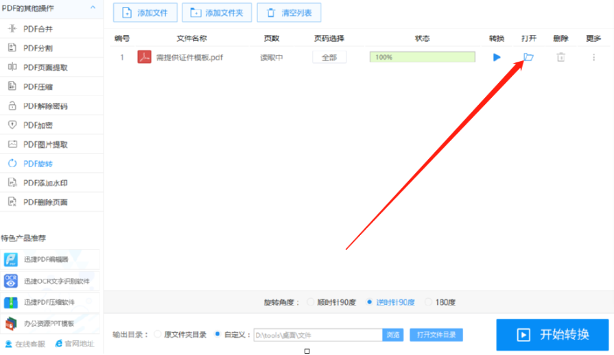 6.等到最后转换完成之后,我们点击界面中打开选项下面的文件夹图标就可以打开旋转之后的PDF文件进行查看了。