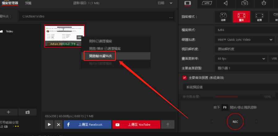 6.紧接着我们鼠标选中录制的视频文件之后用鼠标右键点击它,点击之后在出现的界面中就可以选择“开启输出资料夹”这个选项了,如下图中所示框出的位置所示。