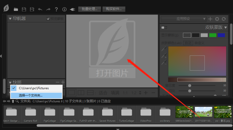 1.首先第一步我们打开软件之后在软件界面中间点击打开图片这个模块,如下图中所示,点击之后添加想要处理的人像图片。