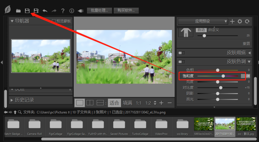 4.打开他下面的功能之后,我们就可以根据自己的需求来调节饱和度了,调节完成之后点击左上角的保存文件图标。