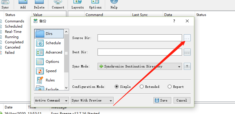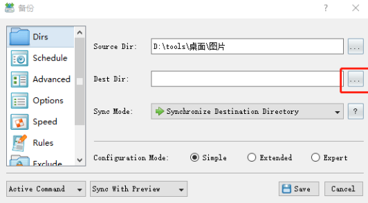 5.点击确定按钮之后下一步是点击Dest Dir这个选项后面的三点按钮,点击之后在出现的界面中选择文件同步的目标位置。