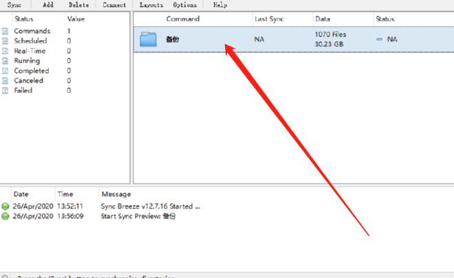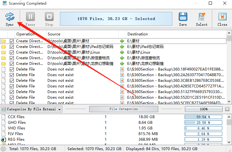 8.双击之后就会打开任务的扫描界面,可以先看到文件夹中的那些文件会进行同步,最后点击左上角的Sync按钮就可以开始同步操作了。