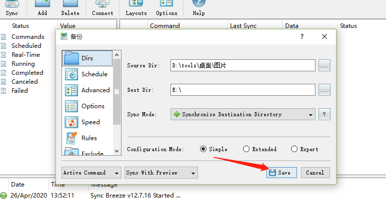 6.同步的文件和同步保存的目标位置我们都选择完成之后,就可以点击界面中的Save这个按钮保存同步任务了。