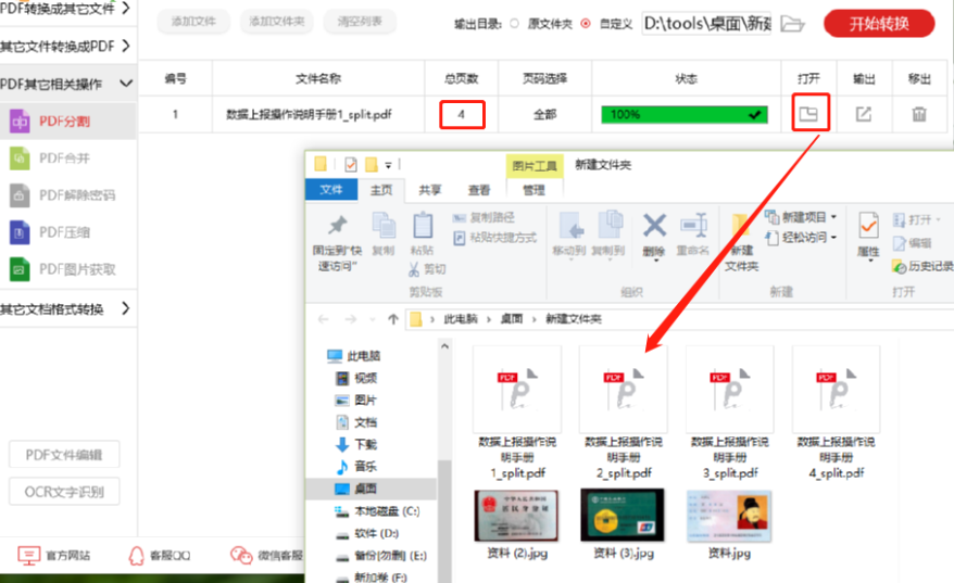 5.等到分割操作完成之后我们点击打开选项下方的文件夹图标,然后就可以看到分割之后的PDF文件了,软件默认的分割方式是按照PDF文件的页面数量进行分割,一页分割成一个PDF文件。