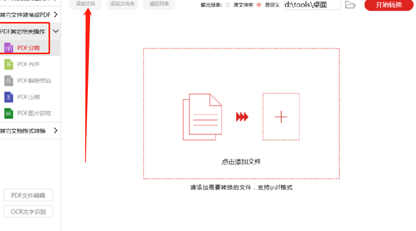 1.首先第一步我们打开软件之后在界面左边选中PDF其他操作选项,切换到PDF分割功能界面之后点击界面中的添加文件按钮。