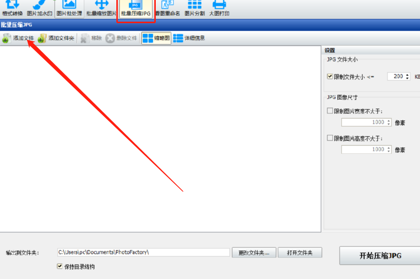 1.首先第一步我们打开软件之后在界面中点击批量压缩JPG这个功能按钮,然后点击界面中的添加文件选项。
