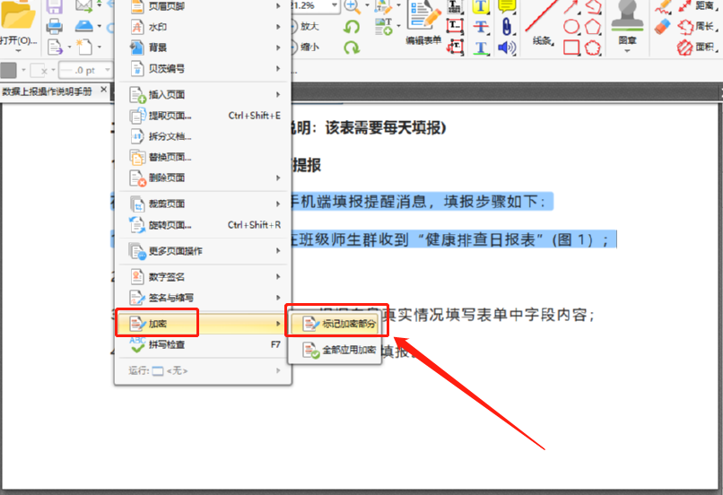 4.点击这个文档选项之后在出现的选项中我们需要点击加密这个选项,然后点击加密后面的标记加密部分选项。