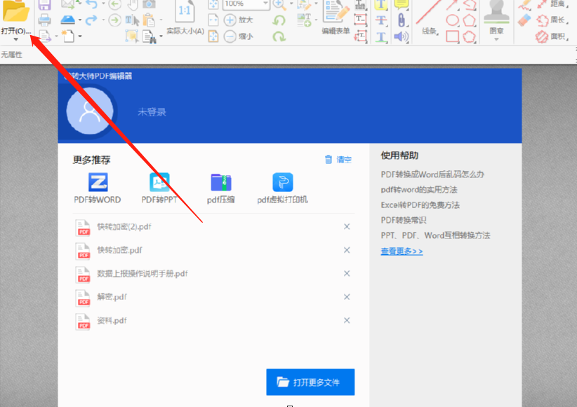 1.首先第一步我们打开软件之后在界面左上角找到打开这个功能按钮,然后点击它准备选择想要加密文档内容的PDF文件。