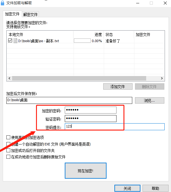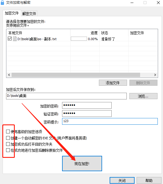 6.最后输入加密密码之后我们可以在下图中框出的位置选择想要加密文件的一些选项,选择之后点击现在加密按钮即可开始加密操作。