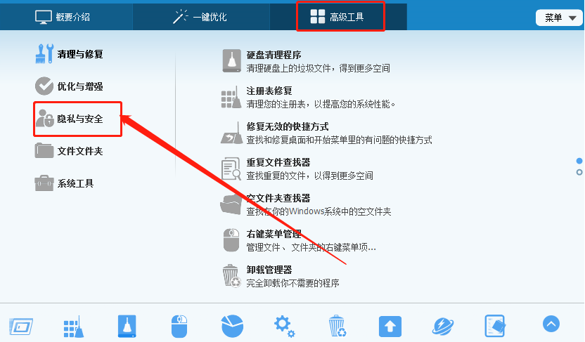 1.首先第一步我们打开软件之后切换到高级工具这个模块中,然后点击隐私与安全这个选项,如下图中所示。