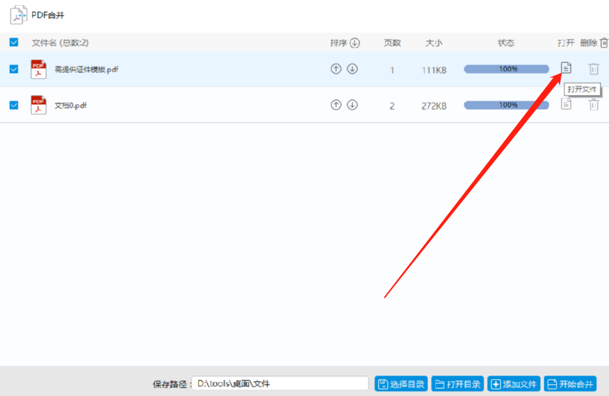 6.最后等到合并操作完成之后我们在界面中可以看到状态为100%,然后我们点击打开选项下面的文件夹图标即可查看合并的文件。