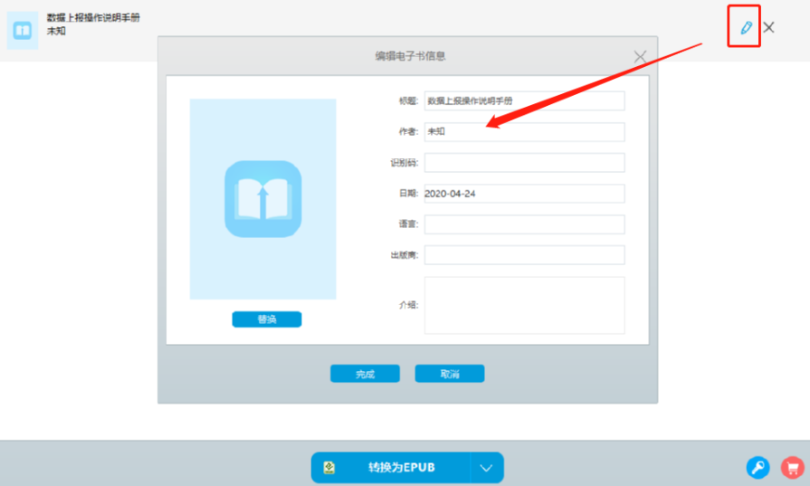 3.点击打开按钮将文档添加到软件界面之后,我们点击界面中的铅笔图标,点击这个铅笔图标之后我们就可以在出现的界面中对转换的电子书信息进行设置了。