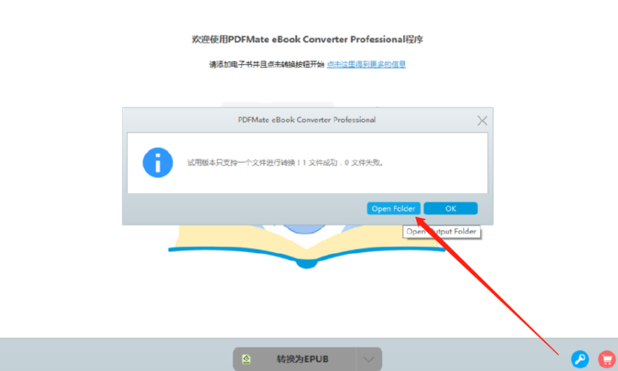6.等到最后转换完成之后我们会看到一个转换结果的提示页面,我们点击Open Folder这个按钮即可打开电子书储存的位置查看转换之后的电子书文件。