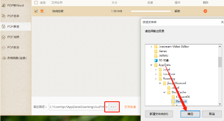 3.需要解密的文件添加到软件界面之后,我们需要点击界面下方的输出路径选项的三点按钮,点击之后在出现的界面可以自定义选择文件解密之后的输出保存位置。