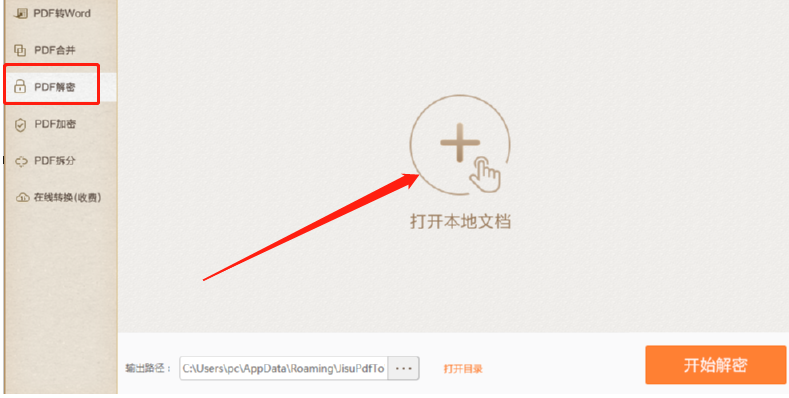 1.首先第一步我们打开软件之后在软件界面左边切换到PDF解密功能,然后点击界面中的加号准备添加文件。