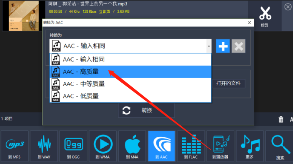 5.打开转换AAC格式的界面之后,我们在界面中点击下拉列表可以选择文件转换输出的质量,如下图中所示。