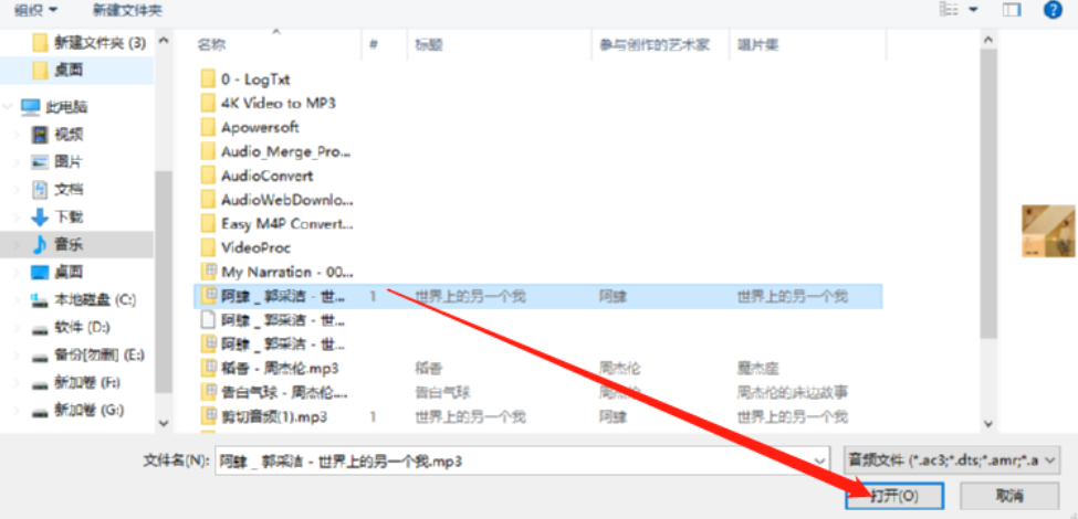 3.点击添加音频按钮之后下一步在出现的选择文件界面中,我们点击选中想要转换的音频文件之后,点击右下角的打开按钮。