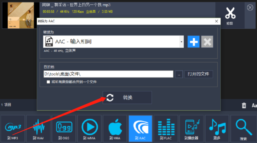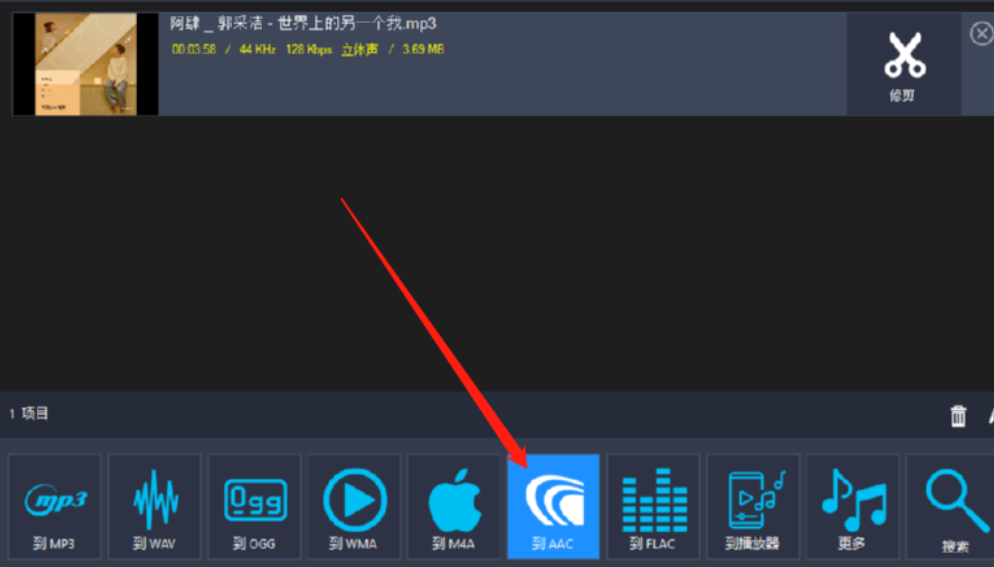 4.将想要转换的音频文件添加到软件界面之后,点击界面下方的到AAC这个功能,然后打开转换AAC格式的界面。
