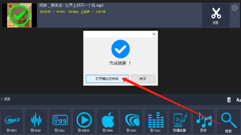 8.开始转换操作之后我们在出现最后的界面中就可以看到转换完成的提示界面了,然后点击打开输出文件夹按钮即可打开转换的文件进行查看。