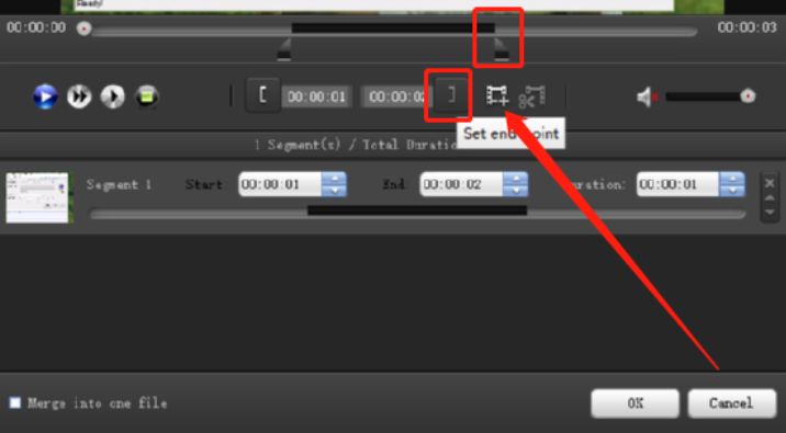 5.我们移动进度条到指定位置,点击“]”图标之后就可以选择结束时间了,然后点击界面中的添加视频片段按钮,如下图中箭头指向的位置所示。