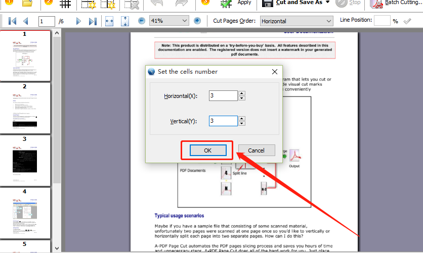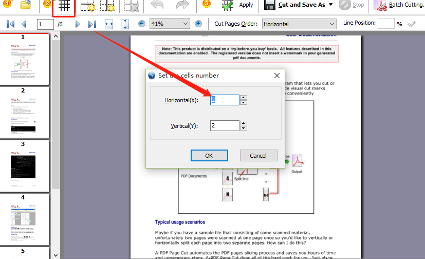 4.点击这个切割文件的图标之后在出现的界面中我们选择好想要分割页面的行数和列数之后,点击OK按钮即可。