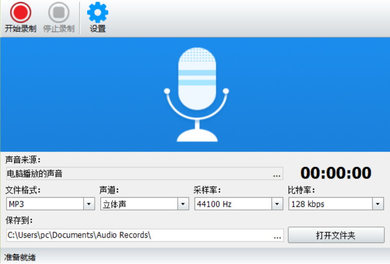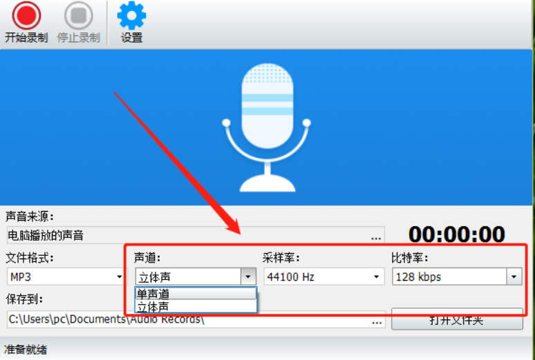 3.另外还有声道、采样率、比特率等录制音频的参数可以供大家选择,有需求的用户进行更改即可,没有需求的用户可以使用默认的参数。