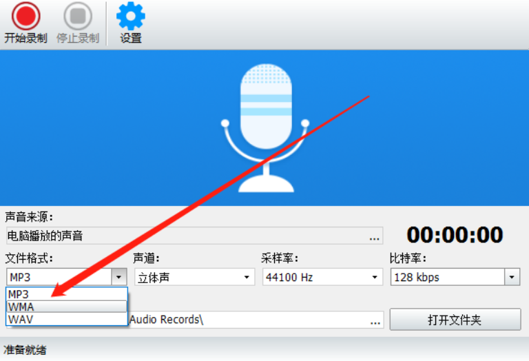 2.选择好录制音频的声音来源之后,下一步我们可以在文件格式这个位置来选择录制音频想要保存的位置。