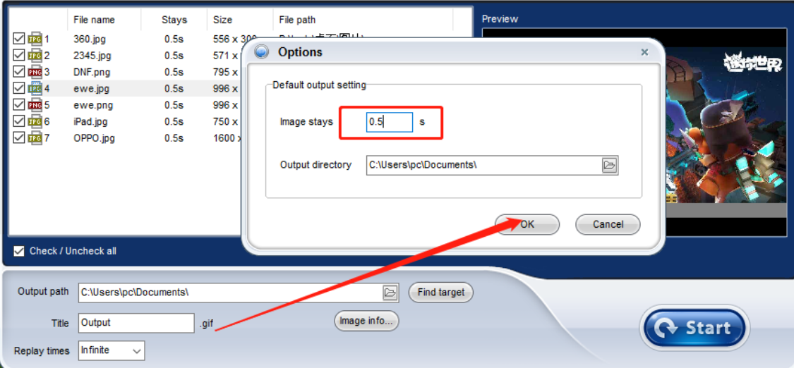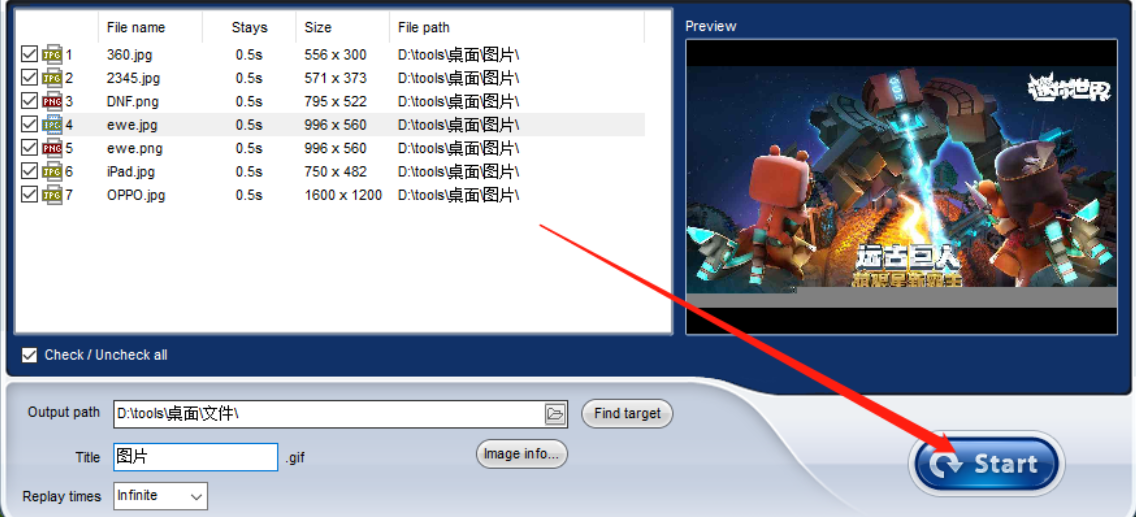 7.最后我们在设置好输出保存路径之后点击界面右下角的Start这个开始按钮就可以开始制作GIF动图了,制作完成之后会自动打开GIF动图供用户查看。
