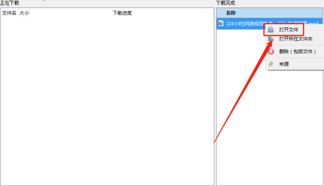 3.等到下载完成之后我们在界面的右边下载完成列表中就可以看到下载的这个网页视频了,右键点击视频文件之后在出现的选项中点击打开文件即可查看下载的视频。