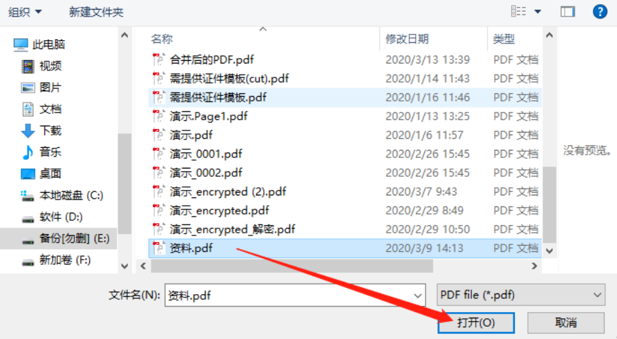3.点击浏览文件按钮打开选择文件的界面之后,我们选中目标PDF文件,然后点击打开这个功能按钮。