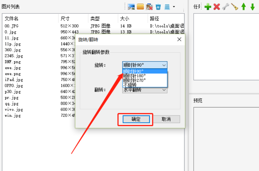 4.点击确定之后就会来到旋转/翻转图片的设置界面了,打开下拉列表之后可以选择想要旋转的角度,用户根据自己的需求进行选择即可,最后点击确定按钮。