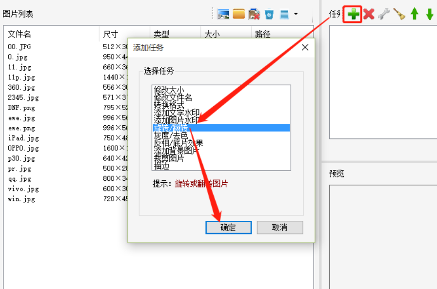 3.点击选择好想要处理的图片之后,我们点击界面中的添加任务按钮,然后在出现的选择任务界面中选择旋转/翻转这个功能并点击确定。