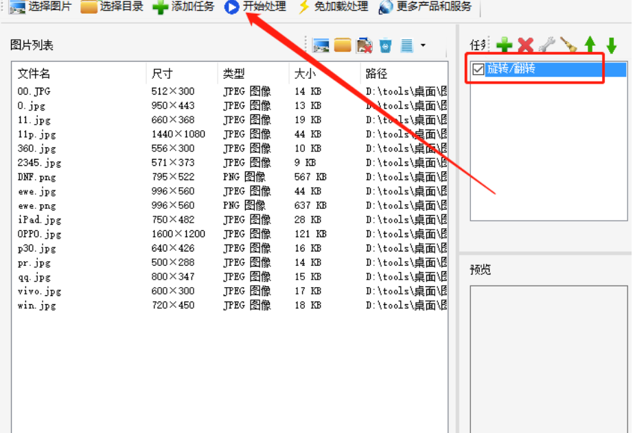 5.点击确定按钮之后就保存好这个旋转图片的任务了,之后回到软件主界面中在任务列表可以看到这个旋转文件的任务,我们点击开始处理按钮即可开始批量旋转图片。