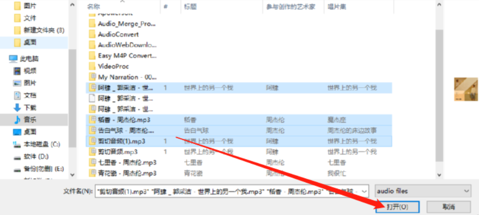 2.点击添加音频按钮之后下一步会打开一个选择文件的界面,在这个界面中我们选中想要降噪的音频之后点击打开按钮。